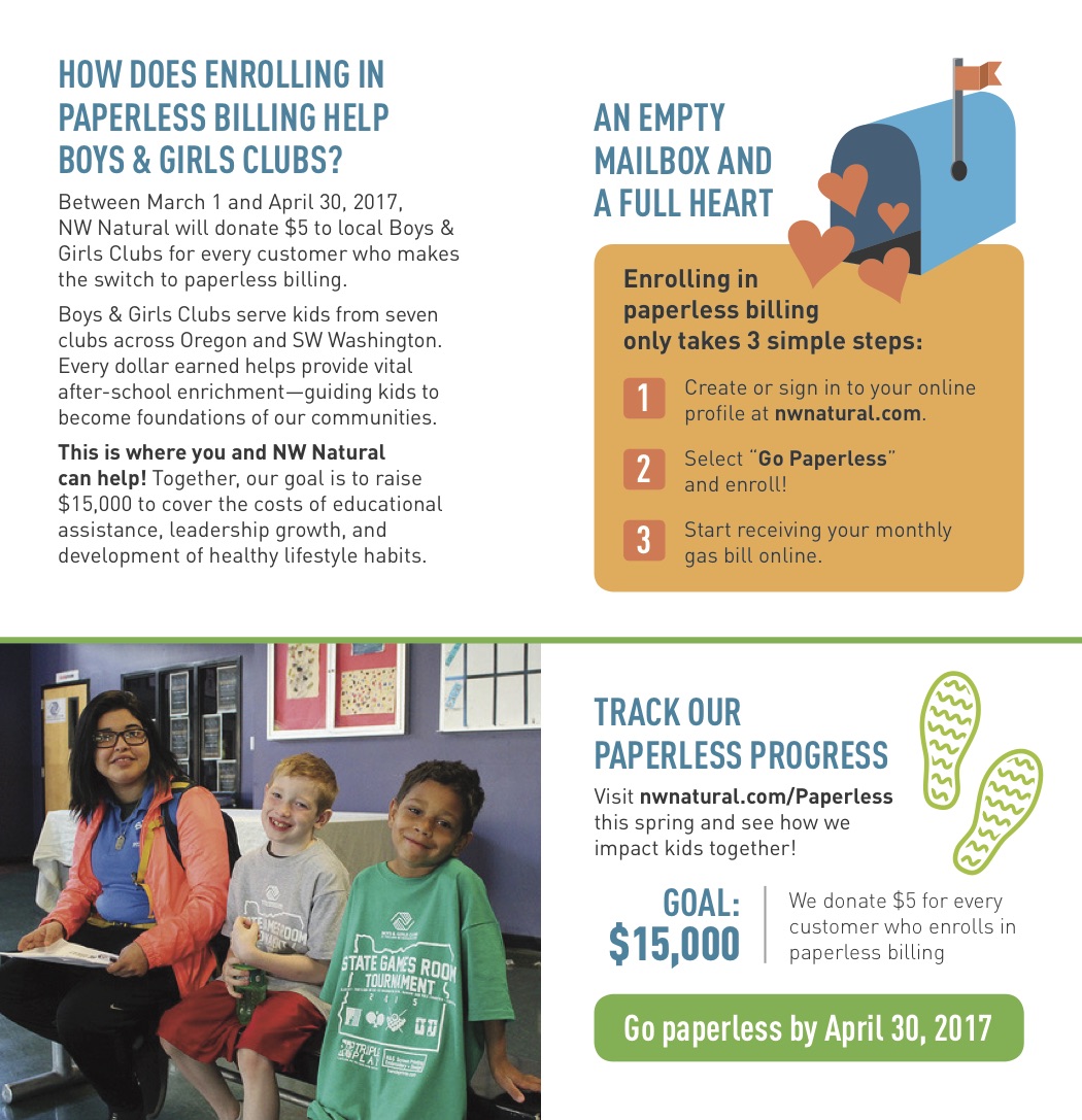 NW Natural Gas partnered with the Boys & Girls Club to incentivize their customers to switch their monthly energy bill to paperless. We created a brochure and webpage, they donated to the community.
